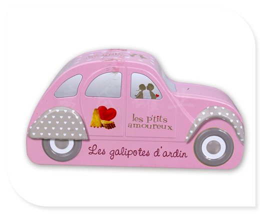 此款汽車形馬口鐵皮盒表面印刷為單面印刷,為CMYK四色+PSM專色處理,鐵盒外觀造型為小汽車形設計,版面整潔簡單,適合包裝各種精美禮品包裝,優雅簡潔的設計風格,能符合兒童年青時代包裝的需求。此款馬口鐵盒的版面設計稿可由客戶自行設計或我司設計。