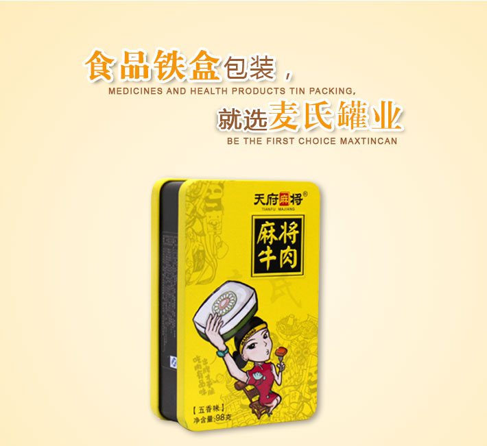 食品包裝鐵皮盒子-訂做食品鐵盒子,食品金屬包裝鐵盒,食品馬口鐵盒加工結構尺寸:160*100*51mm,材質:0.23mm鍍錫馬口鐵制作;印刷:單面或雙面四色/專色印刷??勺黾ね?。雕刻工藝。可提供設計稿件由鐵盒生產廠家麥氏罐業訂做!